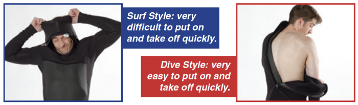 Surfing wetsuit designs keep the zipper as close to the neck as possible. The reason for this is to keep water out of the suit when sitting on a surfboard. These designs offer very narrow entry paths which makes getting into and out of the wetsuit extremely difficult. Spec Ops / SAR suits are designed for rapid deployment, even in confined spaces and tight quarters using full back zip configurations. The BACK ZIP design has proven itself to be a faster and more functional solution to donning rapidly during decades of use in SAR situations. It also does a great job of keeping water out of the suit.